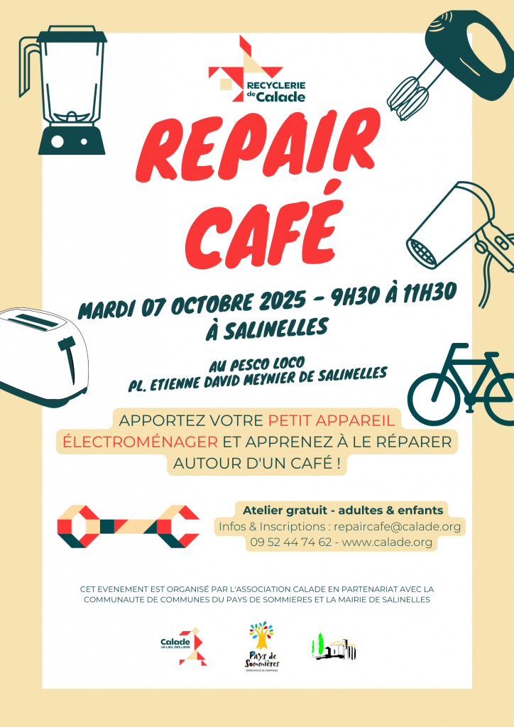 Vous avez un petit électroménager, un appareil électronique ou désormais un vélo en panne ? Ne le jetez pas, réparez-le ! Le Calade vous invite à son Repair Café itinérant de Calade le mardi 7 octobre 2025 à Salinelles. Depuis janvier, les Repair Cafés sont intégrés aux Calade en vadrouille et se déroulent désormais 1 mardi ou mercredi matin par mois de 9h30 à 12h00.
