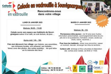 Cette semaine, Calade en vadrouille débarque sur la commune de Souvignargues ! Du lundi 20 au mardi 21 janvier 2025. Retrouvez le programme ci-dessous :