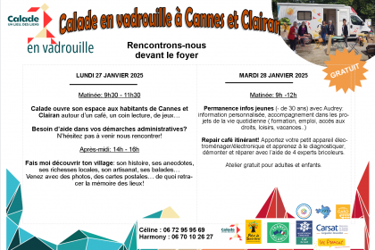 Retrouvez Calade en vadrouille les lundi 27 et mardi 28 janvier sur la commune de Cannes-et-Clairan. Retrouvez le programme ci-dessous :