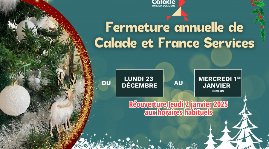 À l’occasion des fêtes de fin d’année, Calade informe ses usagers que les bureaux de Sommières et de Calvisson ainsi que la Recyclerie de Calade …