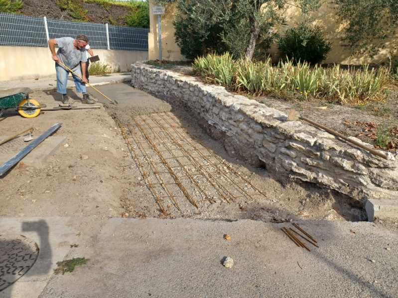 À Montpezat, le chantier progresse rapidement : après la construction du mur en pierre maçonné en redan, les équipes ont coulé une dalle de 100 m². Cette dalle servira de base pour le sol pavé à double pente, conçu pour :