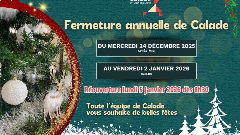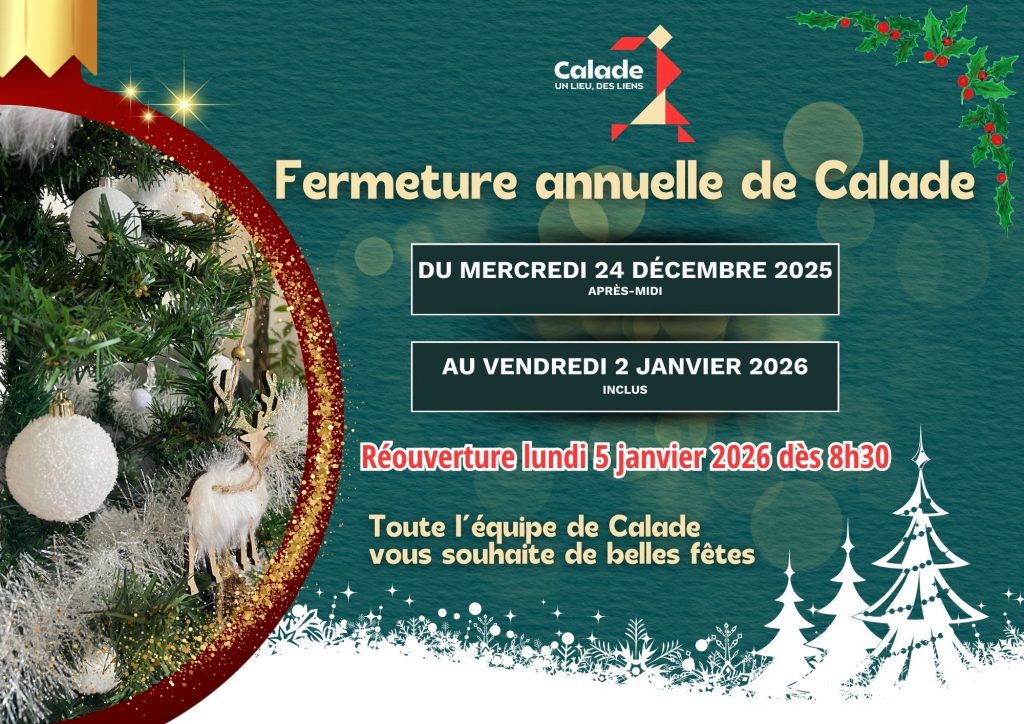 Pendant cette période de fêtes de fin d’année, l’association Calade, Calade Sommières et Calade Calvisson seront fermées du mercredi 24 décembre après-midi au vendredi 2 janvier 2026 inclus. Réouverture aux horaires habituelles le lundi 5 janvier 2026 dès 8h30 à Calade Sommières et Calade Calvisson.