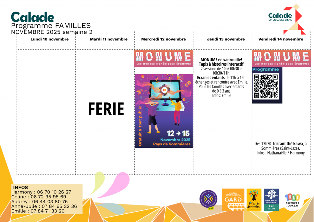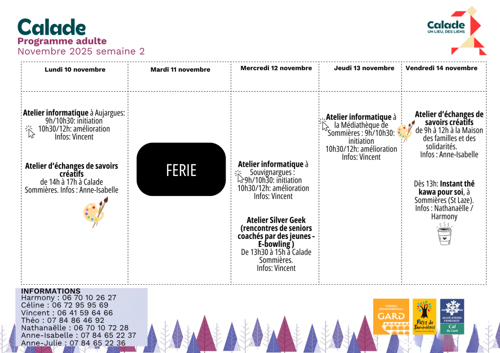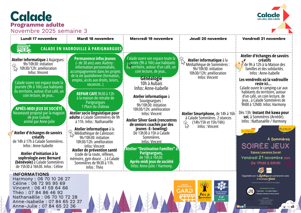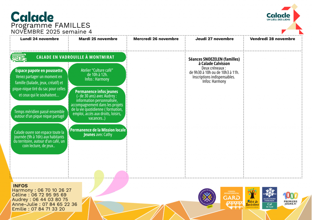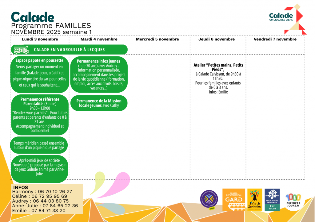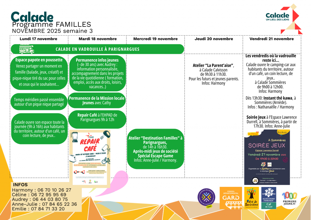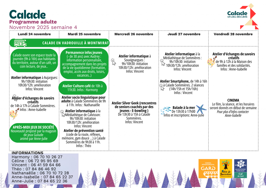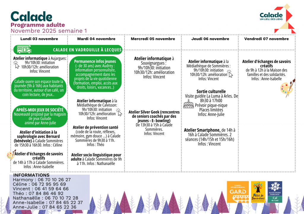 Le secteur Famille de Calade est ravi de vous présenter son programme familles et adultes d’activités pour le mois de novembre 2025 ! Que vous soyez à la recherche d’ateliers ludiques, de sorties culturelles ou de moments de partage en famille, notre planning est conçu pour répondre aux envies de tous.