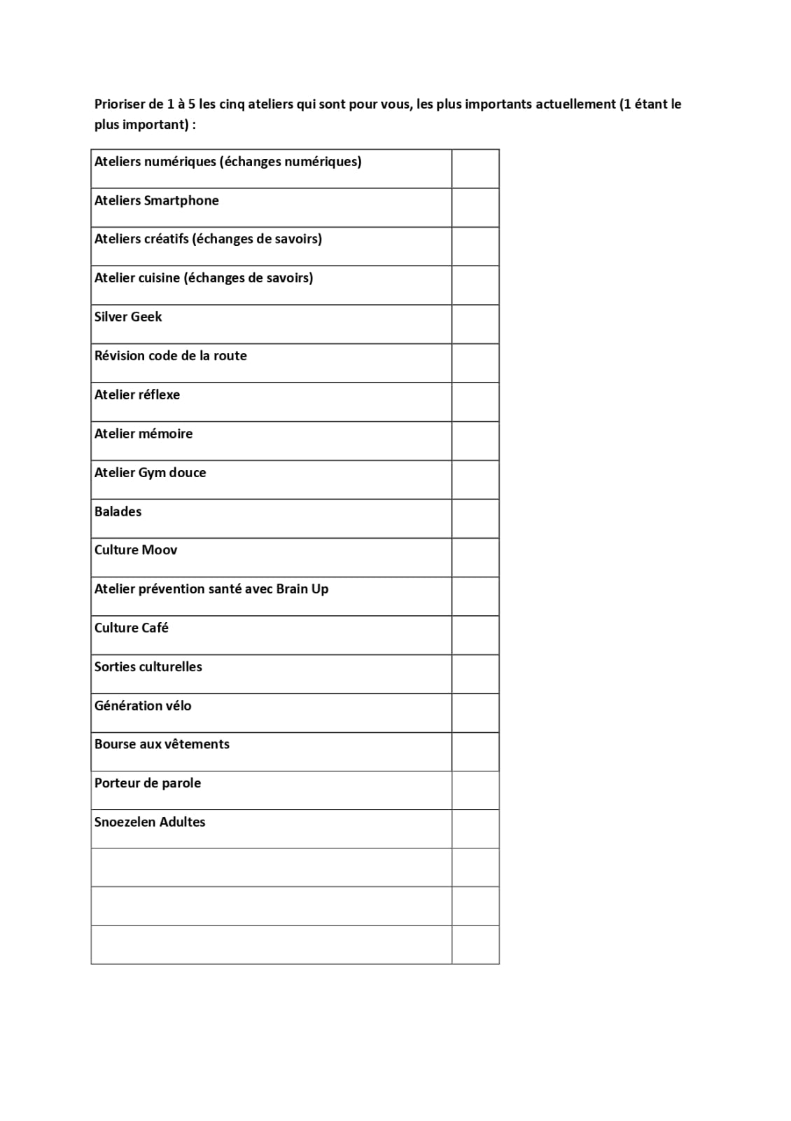 Votre avis est précieux pour nous. En partageant vos préférences, vous contribuez directement à la création d’un programme d’animation qui vous ressemble et qui répond à vos attentes. C’est une opportunité unique de faire une différence et de participer activement à la vie de votre communauté.