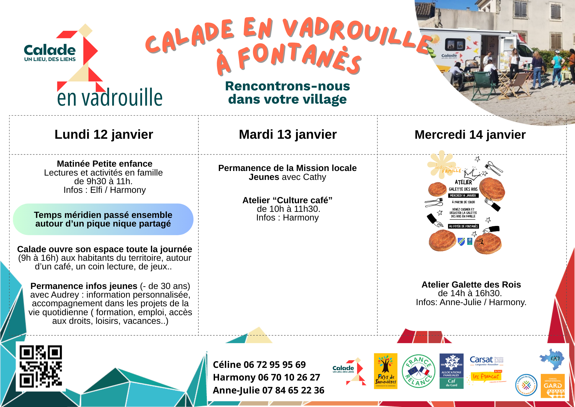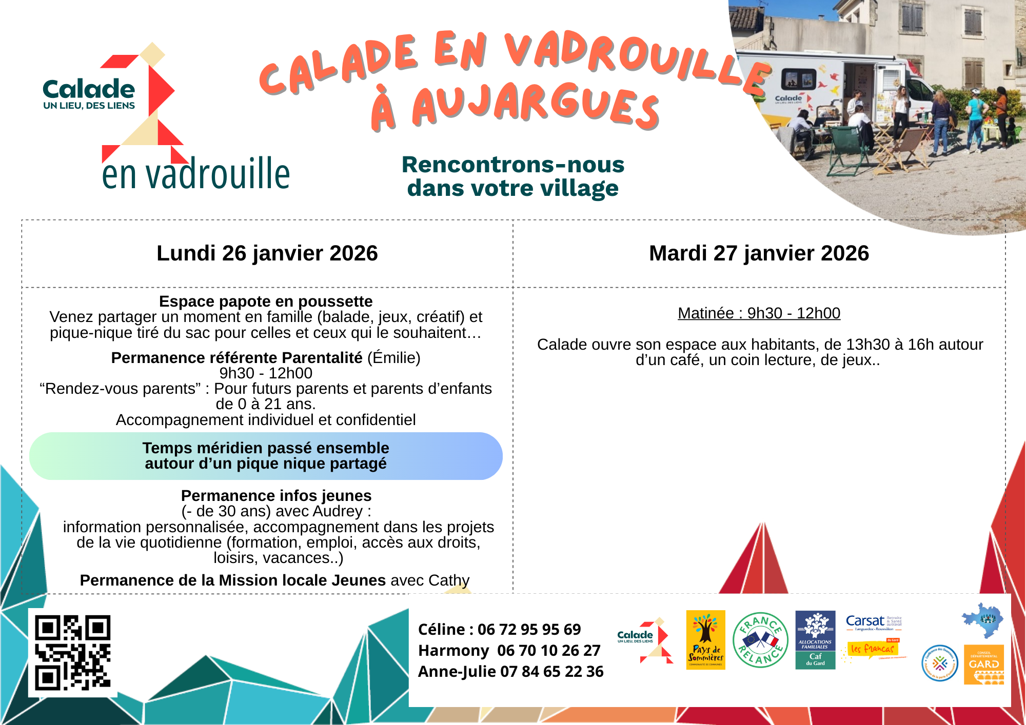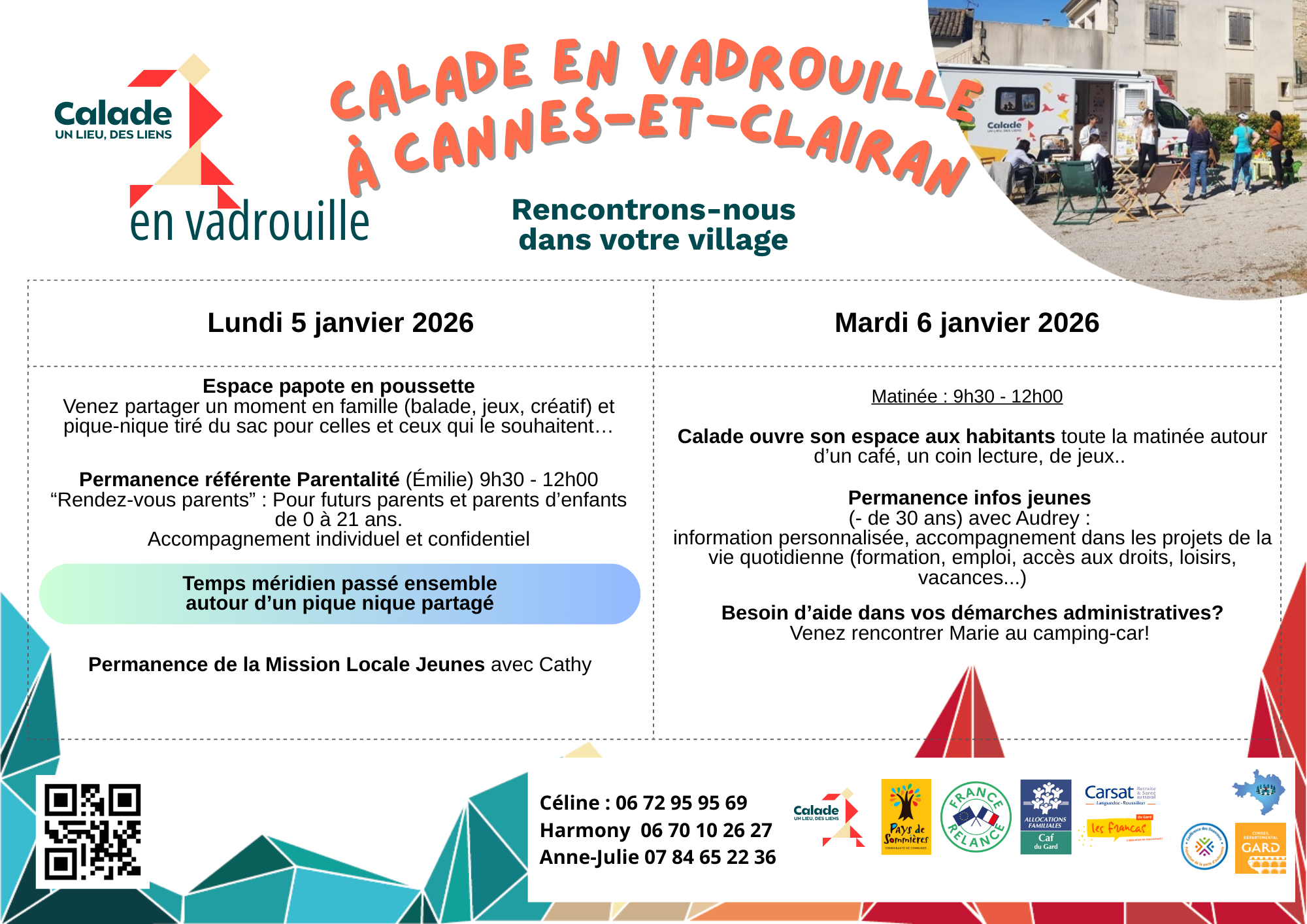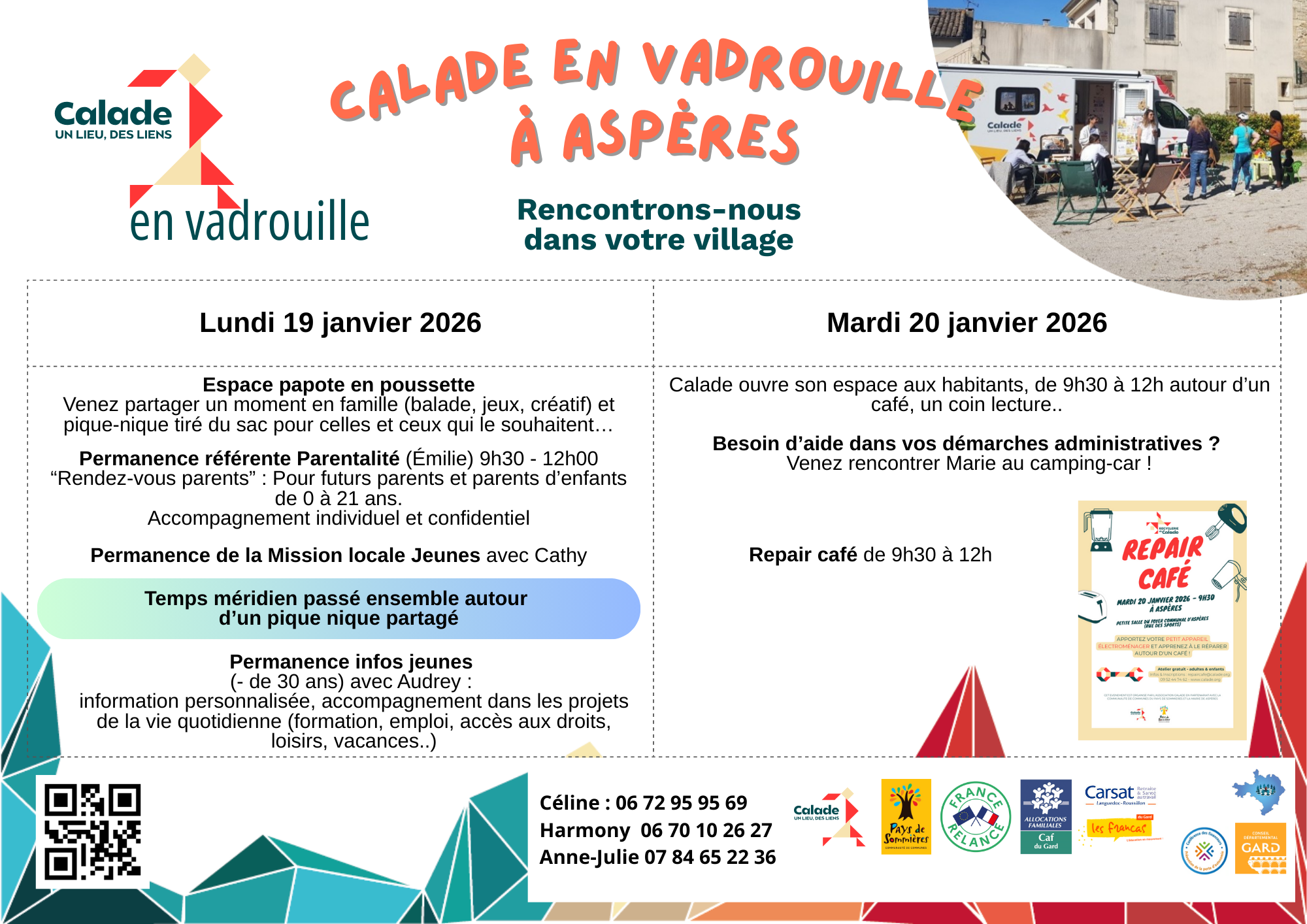 Calade, en collaboration avec les communes, les associations et divers partenaires, poursuit son action itinérante : Calade en Vadrouille. Grâce à un camping-car aisément reconnaissable par son visuel distinctif, cet événement parcourt le territoire de la CCPS pour proposer aux habitants une large palette d’animations et de services. Sauf mention contraire sur le programme, les journées commencent généralement à partir de 9h et se terminent vers 16h30. Petits et grands peuvent ainsi profiter de moments de partage, de découverte et de convivialité au cœur de leur commune. Découvrez sans plus attendre ce qui vous attend lors des prochaines étapes de Calade en Vadrouille en janvier 2026 !