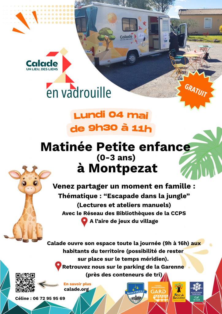 Calade, en collaboration avec les communes, les associations et divers partenaires, poursuit son action itinérante : Calade en Vadrouille. Grâce à un camping-car aisément reconnaissable par son visuel distinctif, cet événement parcourt le territoire de la CCPS pour proposer aux habitants une large palette d’animations et de services. Sauf mention contraire sur le programme, les journées commencent généralement à partir de 9h et se terminent vers 16h30. Petits et grands peuvent ainsi profiter de moments de partage, de découverte et de convivialité au cœur de leur commune. Découvrez sans plus attendre ce qui vous attend lors des prochaines étapes de Calade en Vadrouille en mai 2026 !