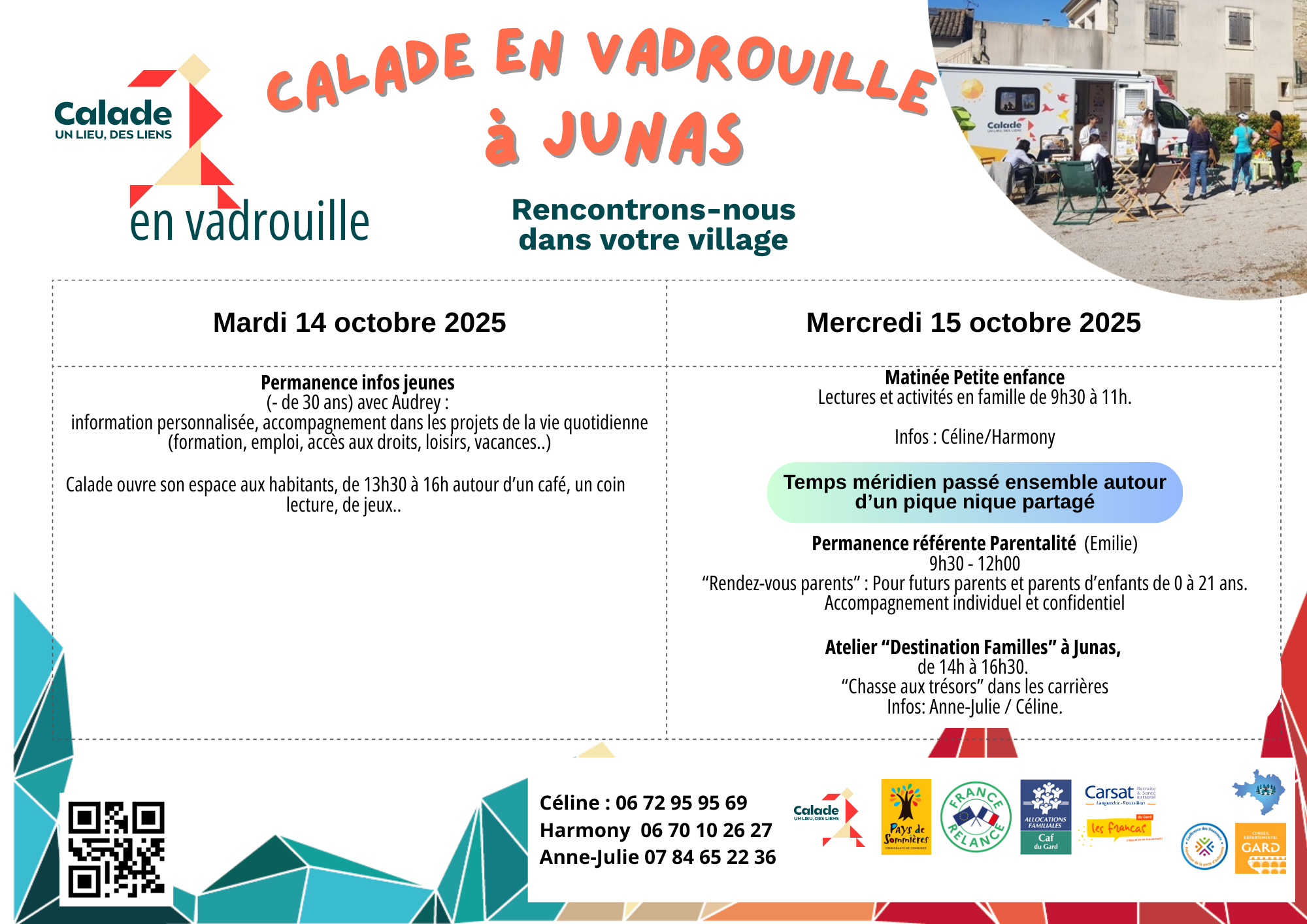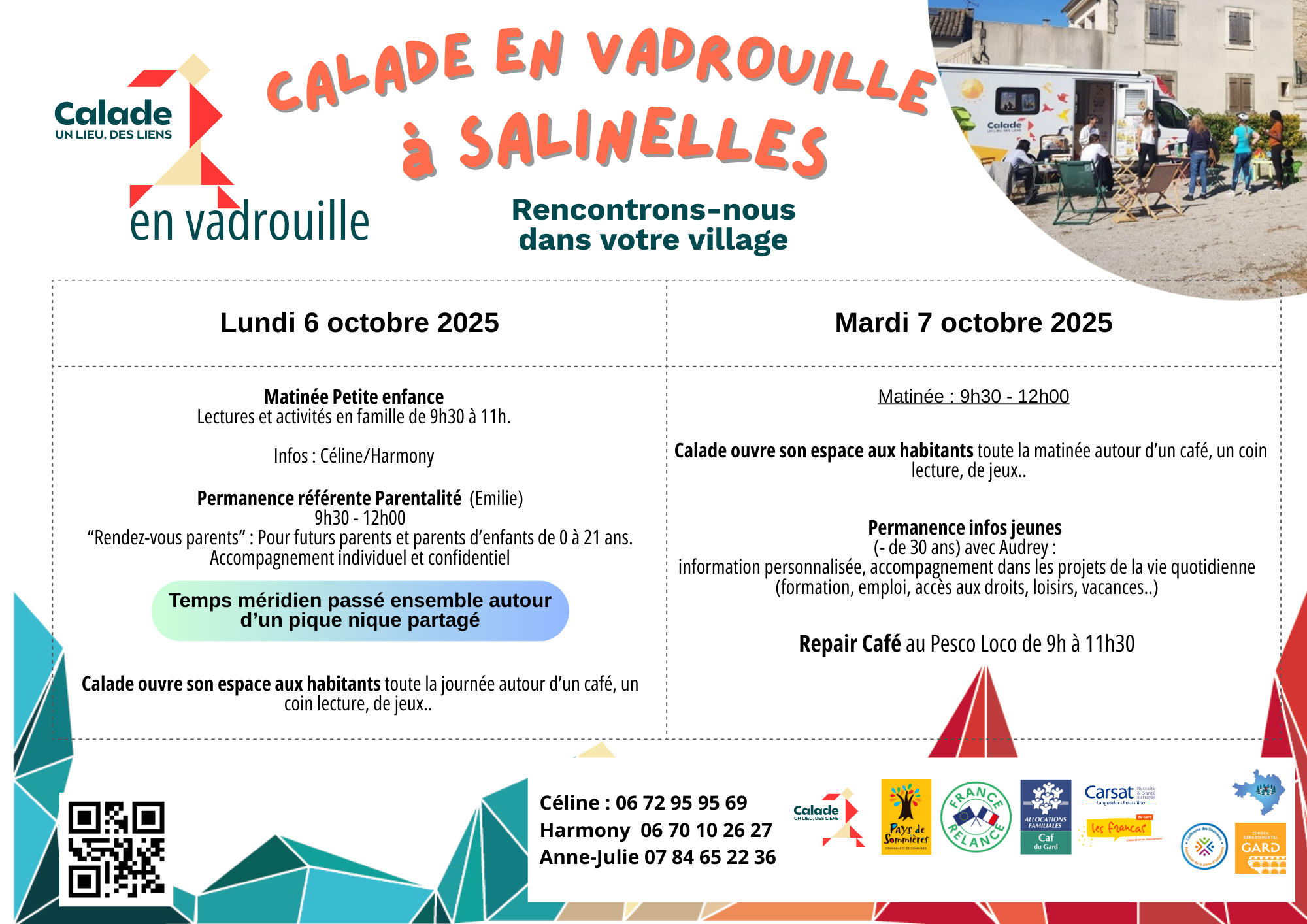 Calade, en collaboration avec les communes, les associations et divers partenaires, poursuit son action itinérante : Calade en Vadrouille. Grâce à un camping-car aisément reconnaissable par son visuel distinctif, cet événement parcourt le territoire de la CCPS pour proposer aux habitants une large palette d’animations et de services. Sauf mention contraire sur le programme, les journées commencent généralement à partir de 9h et se terminent vers 16h30. Petits et grands peuvent ainsi profiter de moments de partage, de découverte et de convivialité au cœur de leur commune. Découvrez sans plus attendre ce qui vous attend lors des prochaines étapes de Calade en Vadrouille en octobre 2025 !