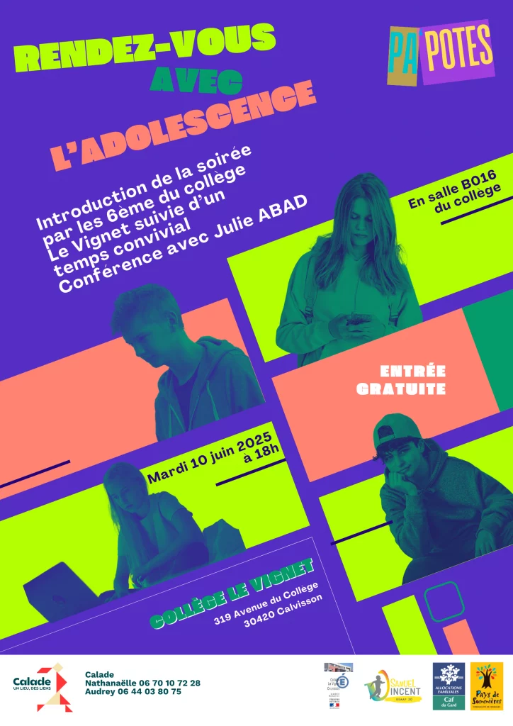 Nous vous invitons à une soirée spéciale dédiée à l’adolescence, introduite par les élèves de 6ème du collège Le Vignet. Cette soirée sera suivie d’un temps convivial et d’une conférence avec Julie ABAD.