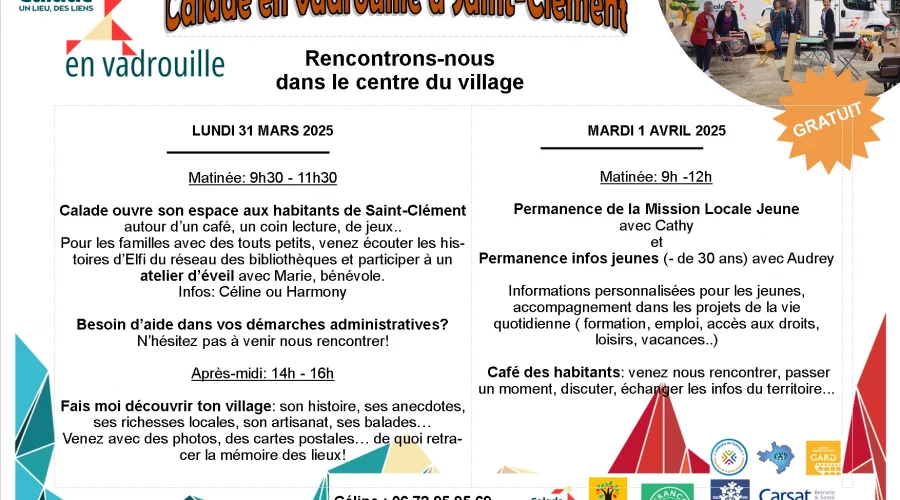 Cette semaine, Calade en vadrouille débarque sur la commune de Saint-Clément ! Du lundi 31 mars au mardi 1er avril 2025. Retrouvez le programme ci-dessous : Rendez-vous au prochain …